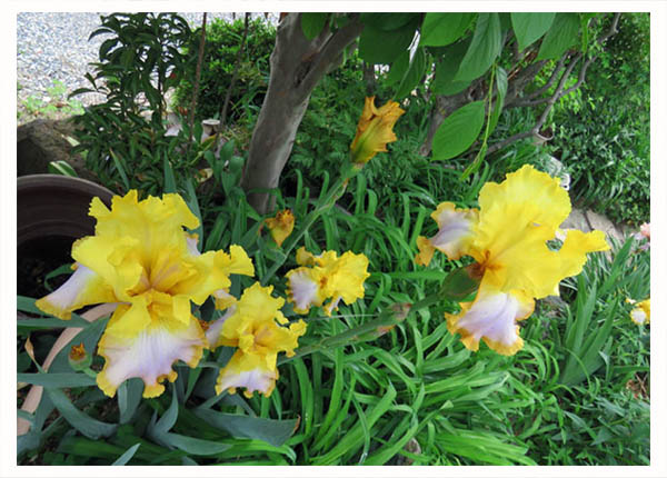 今年は過去最高の咲き具合やっと居場所を気に入ってくれたよう「ジャーマンアイリスをスケッチしてください」と課題に出されたら、何とも捉えどころがない形状に悩んでしまいます。外花被(がいかひ)と内花被(ないかひ)で構成されているようですが、それぞれフリルが付いていて重なり合っているので、単純な形ではなく、じっくりと近くで観察しても複雑過ぎて特徴を掴めません。![]() 形状だけでなく、色も複雑です。我が家のジャーマンアイリスの場合、外側に垂れるか水平に開いている外花被が淡色で、内側で立ち上がっている内花被の色が濃く、それぞれ微妙にグラデーションがかかっています。 例えるなら、中世ヨーロッパ貴族の女性のドレスのようです。 我が家のジャーマンアイリスは全て友人とご近所さんからのいただきもの。友人からもらったのは5、6年前。ご近所さんからもらったのは4年前頃。地植え2か所と大きな鉢1つに植えて手入れをして来ました。 手入れと言っても、根元周りの雑草を除去し、時々顆粒の化成肥料をパラパラとあげ、鉢植え は水あげに注意した程度です。それぞれいただいてから今まで、葉っぱの育ちも程々で、花径もほとんど出て来ず、かろうじて数本咲いた程度でした。いただいたお宅では立派に育ち見事な花を咲かせていたので、きっと手入れが不十分なのだろうと、期待せずに面倒を見ていたところ、今年は葉っぱの成長から様子が異なり、大きくて青々した葉っぱに育ちました。その後、葉に包まれて花径が出て来て、背丈を伸ばし、先っぽには花芽も付けるようになりました。 それでもまだ過去の経緯があるので、「きっと開花せずに萎んでしまうのだろう」と期待半分で様子を見ていると、何と、次々に咲き始めました。しかも付いた花芽は全て開花し、萎んだまま落下した蕾はありませんでした。 「石の上にも三年」じゃありませんが、草花や樹木も、その場所を気に入って定着するまでには数年かかるようです。 今年は更に株数も増えたようで、元の株の近くから数本づつ増えています。株分け方法を調べて増やしてみましょう。(あまり増やすと、地植えにしろ鉢植えにしろ場所探しに苦労するのが課題ですが・・・)。(2024/5/13 記) ▲ページTopへ 【ジャーマンアイリス】 以下、Wikipediaを参照しました。 (ドイツアヤメ(Iris germanica)) ・分類:アヤメ科、アヤメ属 ・特長:アヤメ属の植物を交雑して作出されたもので野生のものはない。 1800年代の初期にドイツ、フランスで品種改良され、その後、アメリカが多数の品種を出している。 ・花期:5~6月ごろ。 |