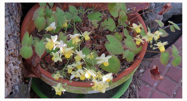 | 鉢植えで育てている我が家のキバナイカリソウ。冬の間は焦げ茶色に枯れた葉っぱと細い茎が残っているだけで、枯れてしまったのか生きているのかよく分かりません。 乾燥を嫌うようなので、一年中水あげに注意していると、4月中旬頃から黄緑色の葉っぱが出て来ます。葉っぱが出る前に淡い黄色の花が咲きますが、花弁が小さく、鮮やかな園芸種の花に比べるといかにも地味で、目立ちません。そんな密やかで遠慮深い風情が好きで山野草や野の花を育てているので、私には十分に愛おしいのですが、一般受けはしそうにありません。 実際に普通の花屋さんやホームセンターの園芸コーナーではあまり見かけません。記憶に自信がありませんが、我が家のキバナイカリソウは、山野草好きな友人からもらったか、深谷市花園の山野草店で購入したかのどちらかです。 今年は例年になく多くの花を咲かせてくれたので、紹介することにしました。繁殖は晩秋頃に株分けで行うのがいいようなので、覚えていたら挑戦してみましょう。(2024/4/23 記) |
