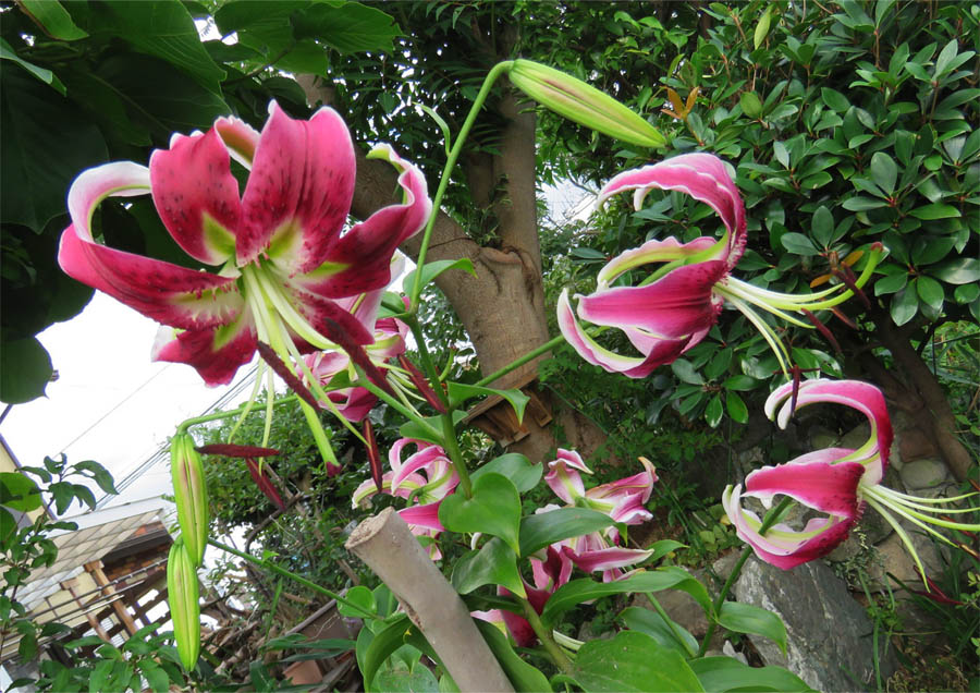 我が家の初夏を彩ってくれるユリ族・オニユリ、スカシユリ、カノコユリ3種のうち、しんがりを務めるのはカノコユリ(鹿の子百合)。 今年の背丈は150cmほど。株数は昨年と同じく3株ですが、背丈が昨年より一回り大きく育ち、花の数も昨年の2倍近く増えました。”捕らぬ狸の皮算用”ではありませんが、この感じだときっと球根も増えているはず。オニユリは勝手に周辺に増殖していますが、スカシユリとカノコユリはきちんと分球してあげた方が良さそう。 晩秋頃に分球で増やしてみましょう。 ![]() 移植でいつも悩むのが植える場所。 地植えが望ましいですが、限られた庭のスペースなので、場所探しに苦労します。カノコユリ近くで生えていたユスラゴの木が今年、突然に枯れてしまったので、その辺を整理して植えようと思います。 このユスラゴ、実家で育っていたもので、我が家に来てから40年、毎年赤い実をタップリと付けて楽しませてくれました。子供の頃は熟す前に摘んで食べてしまいましたが、果物が溢れている現在、食べるより赤い実が可愛いので眺めているだけです。それにしても突然枯れてしまったこと、根切り虫にでもやられたのでしょうか。(2024/9/14 記) ほぼ満開 2024/7/24![]() 咲き始めてから約2週間。ほぼ満開になりました。 2024/7/24 やや7分咲き 2024/7/22![]() 木立の下で太陽を浴びて咲くカノコユリ 2024/7/22 木々に囲まれて咲いています 2024/7/20![]() カノコユリの上にはモクレンやハゼが枝を広げています 2024/7/20 開花も中盤 2024/7/18![]() 背丈は150cmほど。見上げて撮るのが楽になりました。 2024/7/18 ![]() 隣ではオニユリも咲いています 2024/7/18 今年も咲き始めました 2024/7/13![]() 今年も咲き始めました。蕾がたくさんあるので、暫く楽しめそうです。 2024/7/13 |