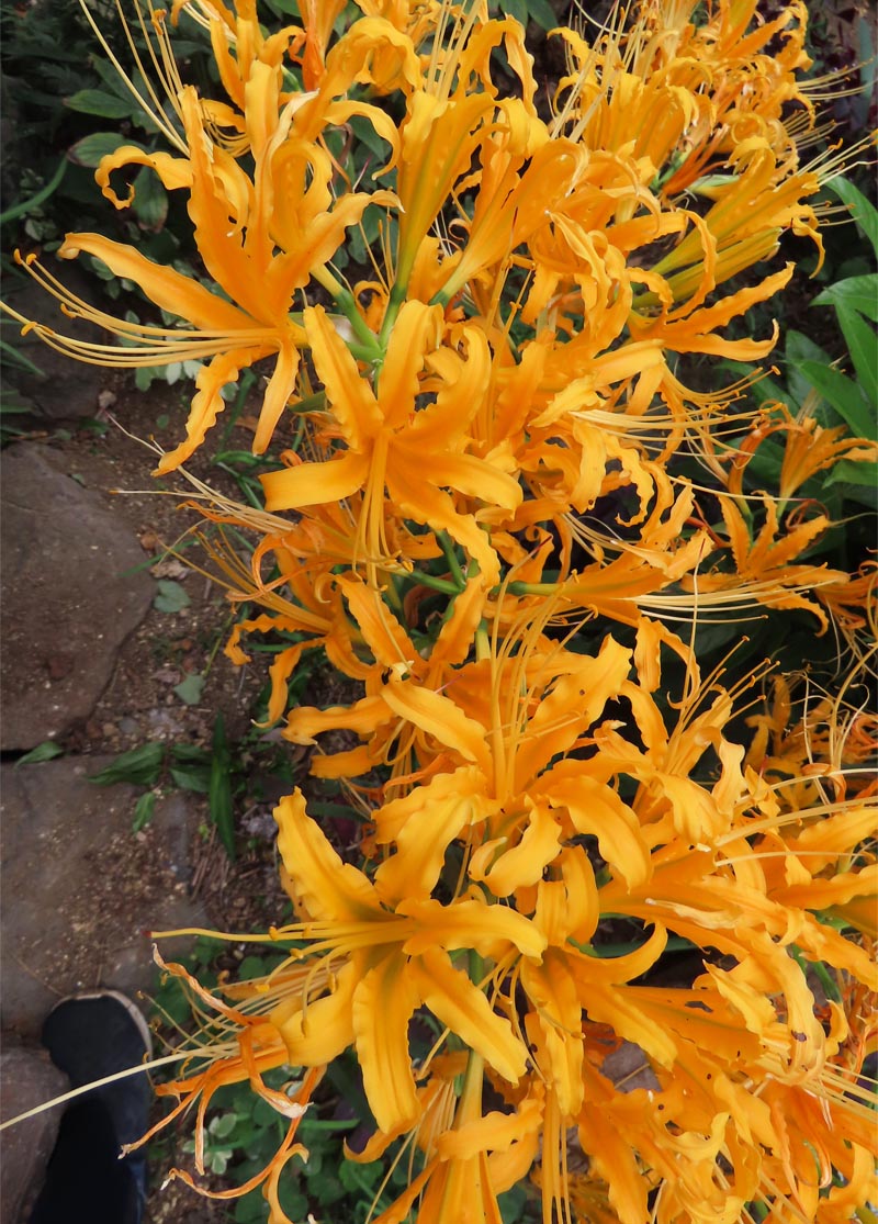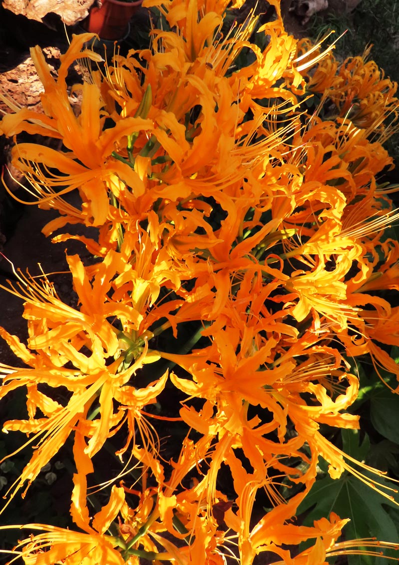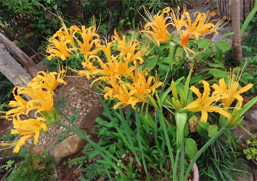 | 今年の10月17日と18日、東京時代の設計仲間4人と年恒例一泊旅行。初日午前に我が家に集合し、出発前の遅い昼食。メインディッシュは群馬のソウルフード”登利平弁当(竹)”。毎年のお決まりの流れですが、今年はちょうどリコリスオーレアが満開だったので、 「よ〜し、今年は4人に見せなくっちゃ。花に興味ありそうなのは一人もいないけど」 と目論んで4人の到着を待っていると、”ピンポ〜ン♪”と玄関チャイム。 「お、来た、来た」と玄関に向かい、ドアを開けると、「あれっ、いない?!空耳?えっ?」 ナント、皆さん、庭のリコリス・オーレアのところへ集まっていて、 「庭の黄色い花が目を惹いたから。彼岸花なんだね〜。黄色い彼岸花があるんだね〜」と驚いた様子。どうやら私の目論みも不要だったようで、それだけ黄色い彼岸花が珍しかったのでしょう。 彼岸花族は、一日花のワスレグサ属と異なり一週間ほど咲き続け、個々の花茎もほぼ一週間以内には開花するので、全部の花茎が咲き揃う姿を眺めることができます。友人が訪れた10月17日と18日はまさに全部が咲き揃った時で絶好のタイミングでした。とは言え、寒さを知ってから咲くリコリスオーレア。夏の猛暑の影響を受け、満開時期は年によって数週間ズレますが・・・。(2024/11/11 記) ![]() 鉢の中で咲き揃ったリコリスオーレア 2024/10/17 ![]() 鉢の中にギッシリ詰まったリコリスオーレア。花茎が伸びた茎は約4割。2024/10/19 ![]() 真上から撮影すると花火のようなリコリスオーレア 2024/10/15 ![]() ほぼ満開。鉢の西側の茎はまだ伸びて来ません。 2024/10/15 ![]() 花の下から見上げて撮影。太陽光の方へ傾いています。2024/10/14 ![]() 一つの花が一週間程度は咲き続けるので、日に日に密集度が増します。2024/10/14 ![]() 黄金色に輝くリコリスオーレア 2024/10/13 ![]() 根元を見ると花茎が伸びたのは全体の約4割。鉢の西面の花茎が伸び悩み。2024/10/13 ![]() 1本がなぜか横に倒れ始めました 2024/10/11 ![]() 開花が始まりました 2024/10/9 |