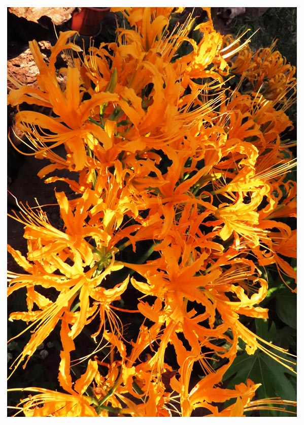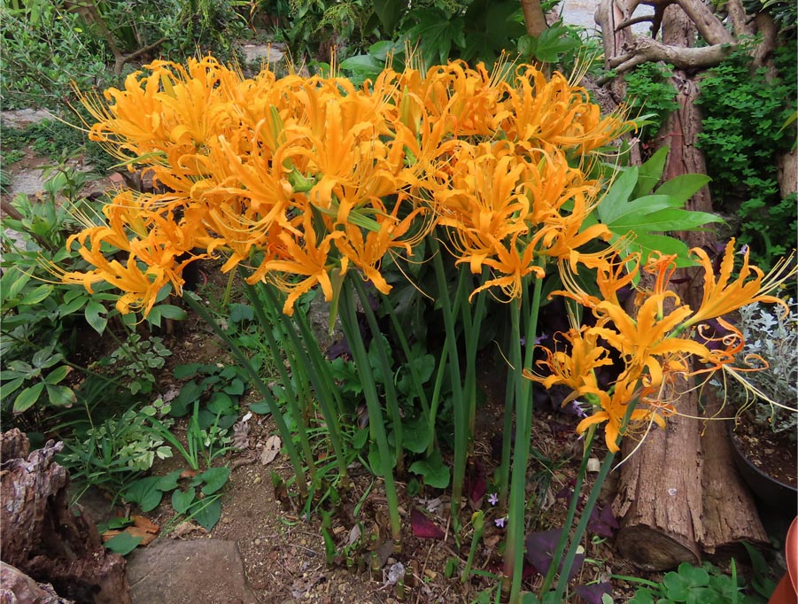 リコリスオーレアを最初に植えたのは半日陰の場所。そこで年々増殖したので5年前に分球し、半分を鉢植えに、半分を元の場所に植えました。昨年までは鉢植えの花茎が伸びず、地植えが元気でした、今年は逆転し、鉢植えからたくさん花茎が伸びてたくさんの花が咲き、一方で地植えが頼りなく、結局・・・最終的に花が付いた茎(花茎)は7本でした。鉢植えとの差で最も大きかったのは日射量。鉢植えは日当たりのいい場所に置き、地植えは朝晩のひと時に日が当たるだけで、ほかの時間はハゼや馬酔木、柚子の日陰でした。土壌や栄養分、水分など、ほかの条件も影響したでしょうが、日射量の影響も大きいようです。(2024/11/11 記)![]() 写真に撮ると山中のようです(右後方の赤い車が見えなければ・・・)。2024/10/17 ![]() ほぼ満開 2024/10/15 ![]() 花径の数は7本 2024/10/14 ![]() 開花が始まりました 2024/10/11 |
