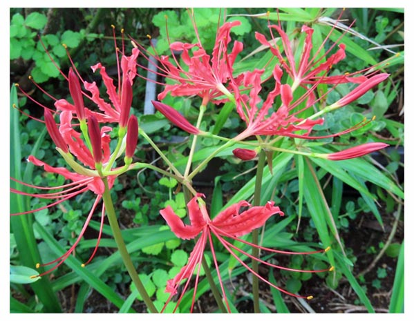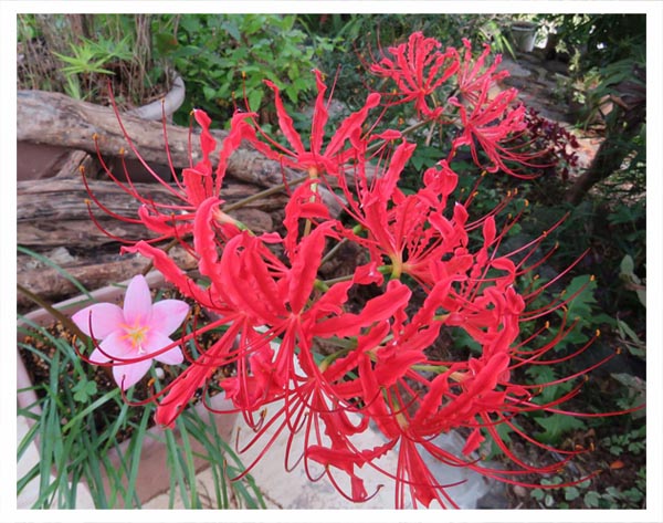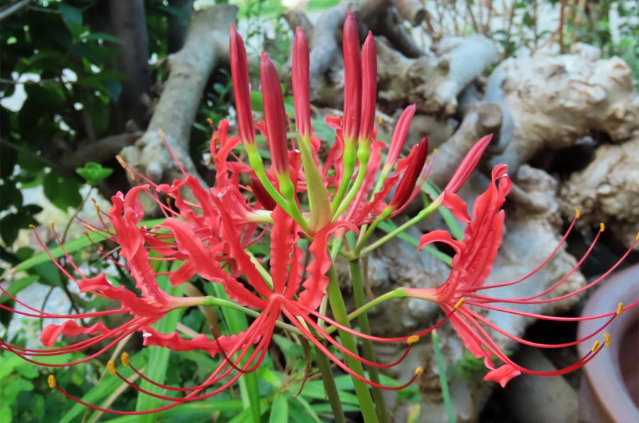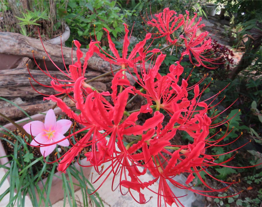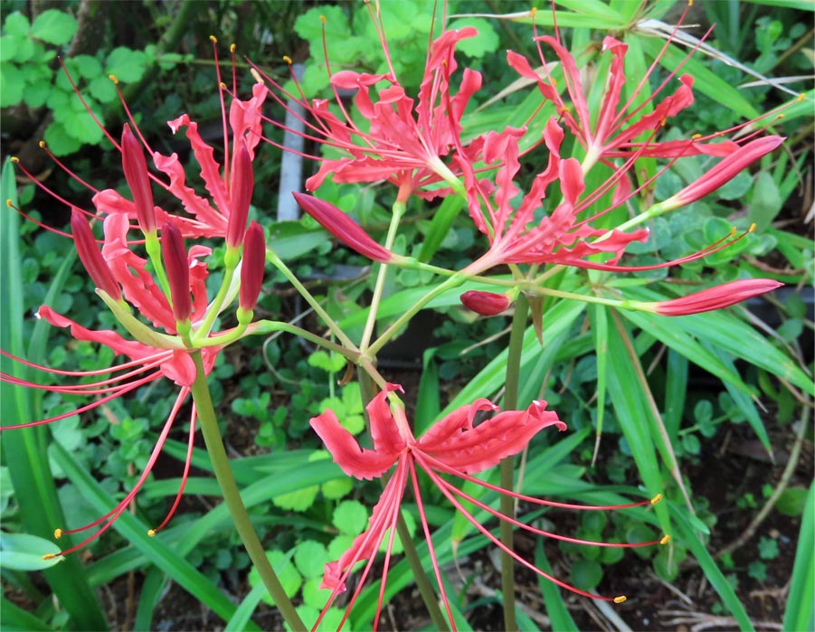 全国的に猛暑日が続いた2025年の夏。ご当地伊勢崎市では9月17日に35.9度、18日に35.5度と、9月中旬を過ぎてもまだ猛暑日となりました。 秋の涼しさを知ってから咲く彼岸花属の花たち。郊外では、早い年には9月に入って間もなく咲き始めます。今年の状況は確認していませんが、我が家ではリコリスが咲き始めました。 ![]() リコリスには数十種類あるようですが、このリコリスの種類は不明です。全体的に普通の赤い彼岸花に似ていますが、茎の長さと花の大きさが少し小ぶりで、花弁の幅が細く、捻じれています。 色が赤系統なことから、リコリスジャクソニアナと仮定して調べましたが、ジャクソニアナは色がピンクがかっていて、花弁も細くはなく、捻じれてもいません。このリコリスの種類は一体何なんでしょう。 難しい話はさて置いて、我が家の庭で咲いた赤いリコリスをご覧ください。(2025/9/20 記) 鉢植えの開花は地植えの一週間遅れ![]() 二手に分かれた赤いリコリス。葉は同居する玉すだれの葉。 2025/9/15 ![]() 赤いリコリス、満開。 2025/9/15 ![]() 細く捻じれた花弁が特徴的です 2025/9/15 先に咲いたのは地植え![]() 半分蕾、半分開花、地植えの赤いリコリス。2025/9/9 ![]() ほっそりとして捻じれた花弁、どこか涼やかです。 2025/9/9 |