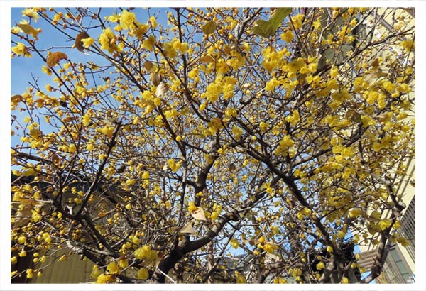 | 【ロウバイ】(Wikipediaの記事を要約) ロウバイ(蝋梅、臘梅、唐梅、学名:Chimonanthus praecox)。中国原産の落葉樹。 分類:クスノキ目、ロウバイ科、ロウバイ属、ロウバイ。 名前の由来:陰暦12月にあたる朧月(ろうげつ)にウメの香りの花を咲かせるため、あるいは半透明で鈍い艶のある花びらが蝋細工のようであるからなどの説がある。 花期時期:1~2月。早生種では12月頃、晩生種で2月。 特徴:黄色く香り高い花がやや下を向いて咲く。 品種:ソシンロウバイ(素心蝋梅)やトウロウバイ(唐蝋梅)など。よく栽培されているのはソシンロウバイで花全体が黄色で、ロウバイよりもよく結実する。ロウバイの基本種は、花の中心部は暗紫色で、その周囲が黄色である。 |