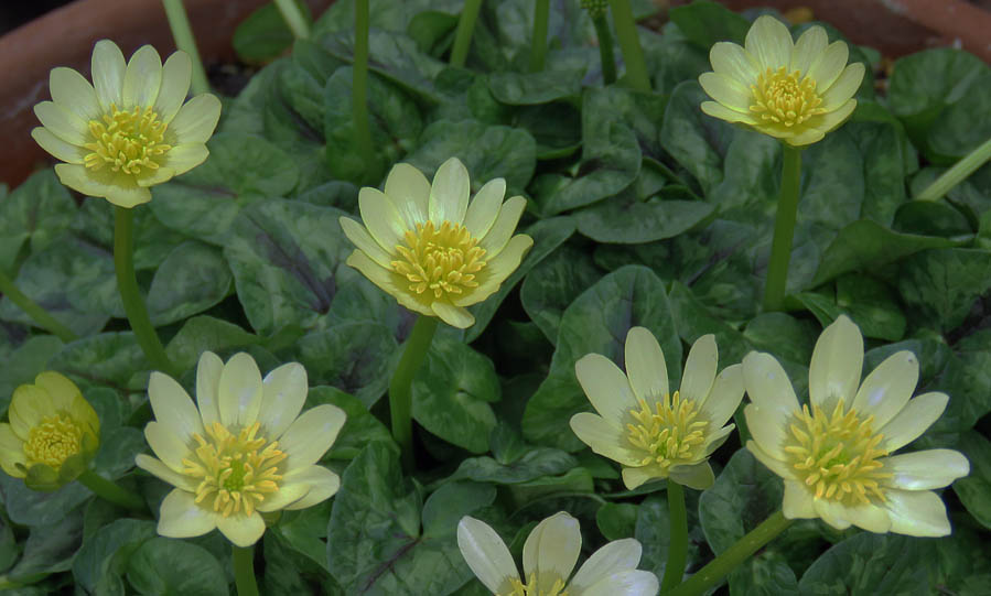 野生種(山野草コーナーで購入したので、野生種と信じて世話をしています)リュウキンカに始めて会ったのは尾瀬ヶ原の木道を歩いていた時。木道脇の湿地の中で茎をスッと伸ばした黄色い花を咲かせていました。尾瀬と言えばニッコウキスゲやミズバショウが有名ですが、実は尾瀬ヶ原は山野草の宝庫。尾瀬を訪れる理由は様々でしょうが、時間に余裕を持った山野草巡りもお勧めです。 初対面が尾瀬ヶ原だったので、「リューキンカは高山の湿地で育つ水生植物」と理解していましたが、ある日、山の方の道の駅だったかどこかで売っていて、「伊勢崎辺りじゃどうせ育たないだろう」と思いながらもダメ元で一鉢購入。2010年頃だったと思います。 無事に育つことを期待せずに鉢植えで世話をしていましたが、何てことはない、予想に反して結構逞しくて毎年律儀に咲いてくれました(下の 2014/3/31 の画像)。しかも水生植物と思って多めに水を上げていましたが、その配慮も不要だったようです。鉢の中で年々増殖するので、ある年、カミさんが「少しチョーダイ」と言うのでザックリと半分あげましたが、残った方の株もまた増えて、2023年の今年は再び鉢一杯に増えました。(2023/4/2 記) ![]() 葉っぱも花も園芸種に比べて小ぶり。色も淡い。2023/3/27 ![]() 鉢一杯に増えました 2023/3/27 ![]() 淡い黄色の花弁 2023/3/21 ![]() 開花が始まりました 2023/3/21 ![]() レモンイエローのリュウキンカ。鉢植えですが、ここ数年、 徐々に増え続け、毎年律儀に咲いてくれます。2014/3/31 |