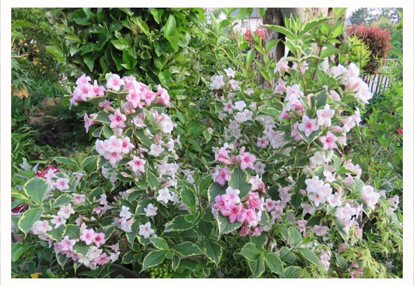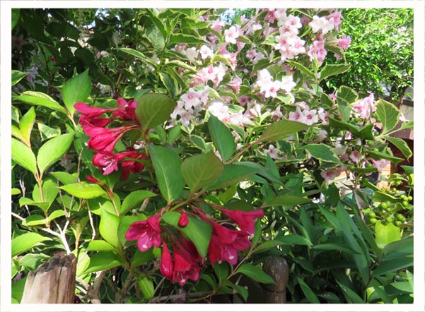 赤いタニウツギはいただきもの、薄ピンクのタニウツギはJA産直の園芸コーナーで購入したものです。薄ピンクのタニウツギは1鉢買えば間に合うのに、同行したカミさんが「私も欲しい」と訳の分からない発言。弁当じゃあるまいし、家に一鉢あればいいだべと思いましたが、小さな鉢で値段も数百円と安く、枯らしてしまった場合の保険として2鉢あってもいいかと、結局2鉢購入。どうやらカミさん、斑入りの葉っぱを気に入ったようです。