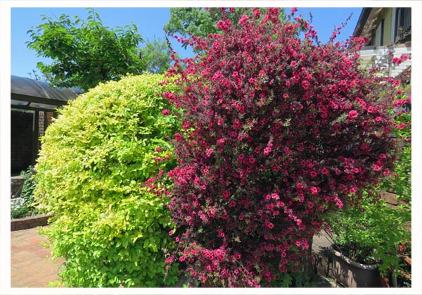 葉が黄色い木 我が家には葉っぱが黄色い木が5本あります。種類は3種類。名前は一つも分かりません。そのうち1種類が3本あって、2本はカミさんが挿し木で増やしたもので、全て地植えしてあります。成長力が強いので、脚立を使わずに剪定できるよう、背丈を超えると床屋さんをします。残り2種類は鉢植え。友人からいただいたものです。1種類はコデマリのような小さな花を咲かせます。黄色い葉っぱは遠目には花が咲いているようで、また常に新緑のように爽やかなので気に入っています。消毒をしたことはありませんが、害虫が付いたことはありません。(2024/7/7 記)