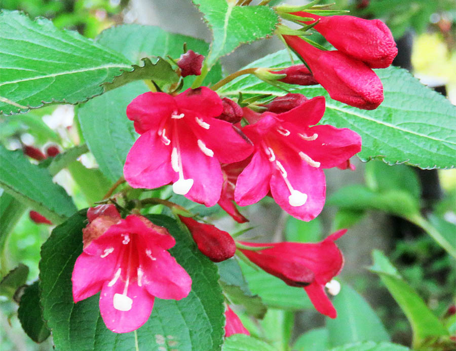 | ウツギ(空木)の分類は「ミズキ目・アジサイ科・ウツギ属・ウツギ」、名前「ウツギ(空木)」の由来は幹(茎)が中空であるためとのこと。 同じ「ウツギ」の名前が付くならば、どれも似通っているはずと思いきや、そうは問屋が卸しません。我が家には3種類のウツギがあり、一つは白くて小さくて、「卯の花」と呼ばれるウツギ。残り2つは花弁がもう少し大きく、形もハッキリしているウツギ。ウェブで画像検索すると、似ているのはサラサウツギやタニウツギ。正確には分かりませんが、ここでは赤いウツギ、白とピンクが混じったウツギとして紹介します。 赤いウツギは「オープンガーデンいせさき」のある庭主さんから5,6年前、鉢植えしていたものをいただいたもの。その後、二回りほど大きな鉢に植え替えて育てたところ、背丈が1mを超える大きさに育ちました。 白とピンクが混じったウツギは、前橋市小島田のJA産直に出かけた時、鉢植を購入したもの。その時は開花期でなかったため花の色は不明でしたが、斑入りの葉っぱが気に入ったので購入しました。カミさんは店内で買い物をしているので先に車に戻っていると、ナント、カミさんも同じ鉢を持って戻って来ました。「あれ?それ買ったよ?でも、ま、いいか、ペットボトル1本半程度の値段だし」 と言うことで、同じ鉢を2つ購入することに。カミさん、よっぽど気に入ったのか、「挿し木で増やしてみる!」と奮起して、新たに数本増やしました。その内の1本と購入した2本と併せて3本が庭のあちこちで育っています。挿し木で増やした木の方が環境が良かったせいか、一番元気です。(2022/6/2 記) |