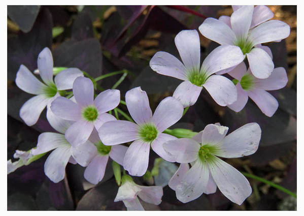 | 我が家のカラス葉オキザリスは、カミさんが数年前に友人からいただいたもの。濃い赤紫色の葉っぱで花がほんのりと赤色をしています。カラス葉の命名通り、遠目には葉っぱの色は真っ黒です。葉っぱの形はほかのオキザリスが丸いのに対して、こちらは三角形で、花と葉っぱの白と黒のコントラストが特徴的です。 繫殖力はほかのオキザリスに比べると強くなく、もらって来た時に庭の何か所かに植えたままの場所に留まっています。我が家では5月頃から咲き始め、秋まで咲き続けます。冬には萎れた葉っぱが地面にぺったりと貼り付いて、「枯れても宿根でここにいるんだからね、ほかの草木を植えないでよ」と存在を示しています。「ハイハイ、植えませんよ。でも場所を取るんだよね。」(2023/6/25 記) |