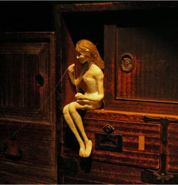 ![]() 部屋を埋めるお膳や扇子、散らかるとっくりやお銚子。 さしずめ昔の結婚式会場です。 |