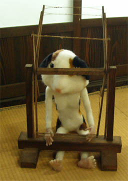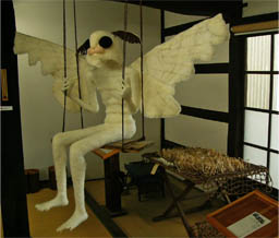| 赤岩集落の「かいこの家」に展示されている様々な養蚕用器具。それらと戯れる牛やウサギ、鶏、犬などの動物人形。農機具が遊具に変わるお伽噺のような空間です。 | ||