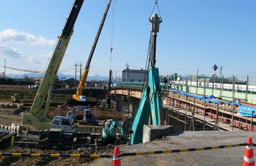 | 2010/1/9、硬質地盤クリア工法(*1)により、既設橋梁の各橋脚に近接した位置で、鋼矢板の圧入作業が行われていました。 (*1)玉石混じり砂礫層などの岩盤層を含む地盤に鋼矢板を打ち込む工法。狭い場所での低振動、低騒音での施工が可能。 |