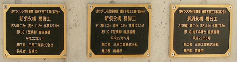 ![]() 右岸橋台(A1)に貼られた橋名板 2010/6/5 今回の下部工は2社が請け負いました。 右岸側(西側)が三原工業さん、右岸橋台(A1)+橋脚2脚(P1,P2) 左岸側(東側)が稲村建設さん、左岸橋台(A2)+橋脚(P3)です。 |