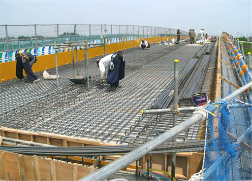![]() 既設橋梁(右側)の床版と 補強桁上の床版の鉄筋定着部。 2012/2/12 ![]() 拡幅部(左側)と既設橋梁(右側)との間に設置された補強桁の上では、補強部のRC床版の鉄筋組み立てを完了。 2012/2/12 |