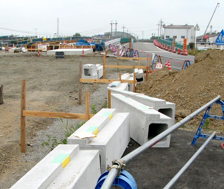 ![]() 左岸側の道路のすり付け部では 側溝を布設中 2011/7/3 ![]() 右岸側の道路のすり付け部では 拡幅部の路盤工が進んでいます。 2011/7/3 |