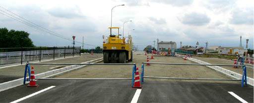![]() 橋梁西側の道路で舗装工事中 2011/7/16 ![]() 左岸側橋台部 2011/7/16 ![]() 左岸橋台の東側の新設道路 2011/7/16 |
