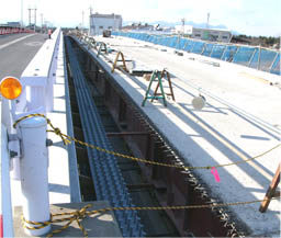 ![]() 左岸側の伸縮装置 既設桁(後方)と拡幅桁(手前)とでは 桁長が異なっています。 2012/5/13 |