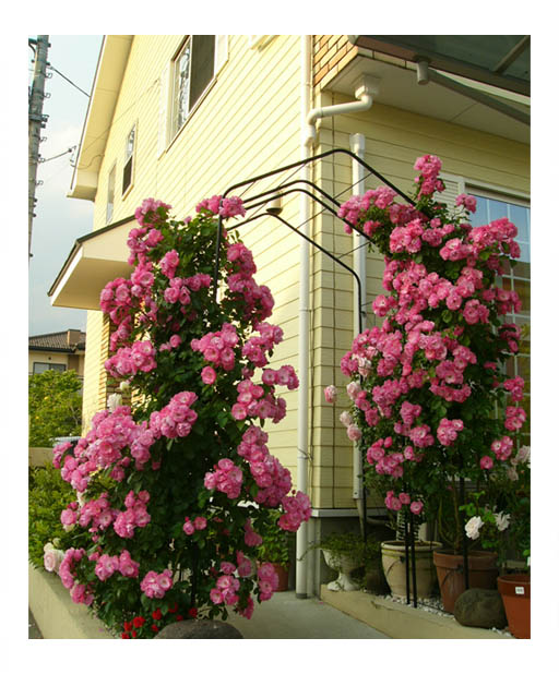 ![]() 玄関へのアプローチを飾るピンクのバラのアーチ。 ![]() 隣家への通路から眺めるミックスガーデン。木の下で涼しそうに咲く紫ラン。 ![]() 駐車場奥を飾るバラ |