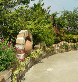 ![]() ![]() 立体的なカーブで積まれたレンガ塀。レンガの色が微妙に異なるのが楽しい。 |