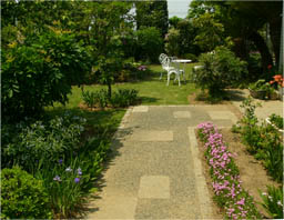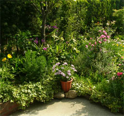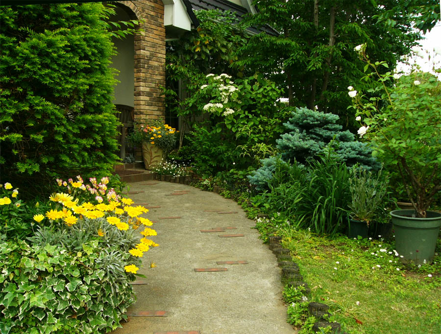 ![]() 玄関周りを飾るたくさんの花たち。玄関前で来訪者と話しに花が咲きそう。 ![]() 前庭の東側。駐車場と接しています。隣家との境界には常緑樹。 ![]() 前庭の奥。木陰で涼しげに咲く花。 |