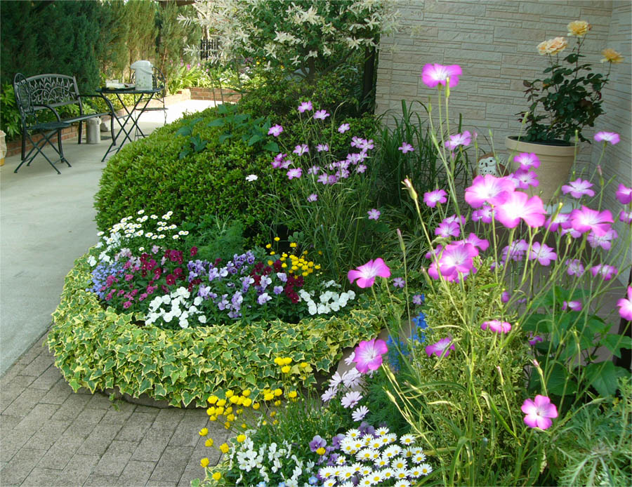 | 【訪問日】2013年5月18日 公開日初日の午後にお邪魔しました。”ETUKOの庭”には実にたくさんの花が咲き、絵本の中の庭のように可愛らしくレイアウトされていました。玄関周りを飾る花たちに目を奪われながら、奥へ進むと前庭が芝生広場になっていて、その周囲の花壇にたくさんの花たちが咲いています。芝生との境界はハツユキカズラで縁取り、その葉っぱの複雑な色の変化がまた彩を添えています。前庭の花壇の中に作られた小路を通って南側に行くと、家庭菜園や柑橘系の木が植えられた畑があって、ここ数年、シッカリと甘いミカンが生るとのことで、これもまたガーデニングの楽しみの一つと思いました。 玄関周りの寄せ植えや塀に下げられたハンギングバスケットの花、また芝生周りの花がちょうど満開で見ごろだったので、奥様に尋ねると、一ヶ月ほど前から、茎を刈り込むなどして、公開日に合わせたとのことです。花の生育過程を熟知していることと、感心してしまいました。可愛らしい庭・”ETUKOの庭”でした。(2013/5/23 記) |