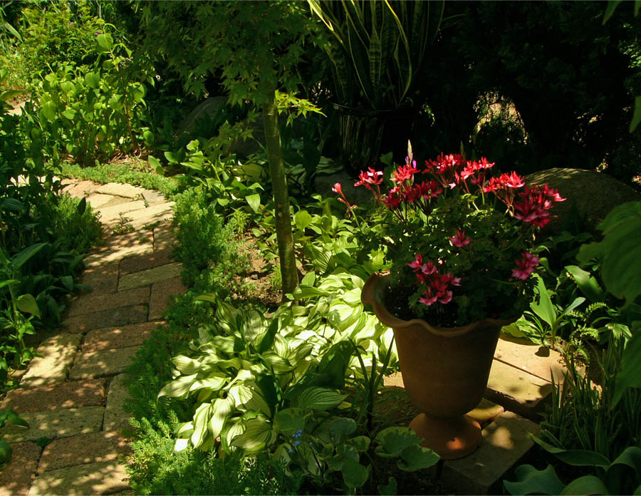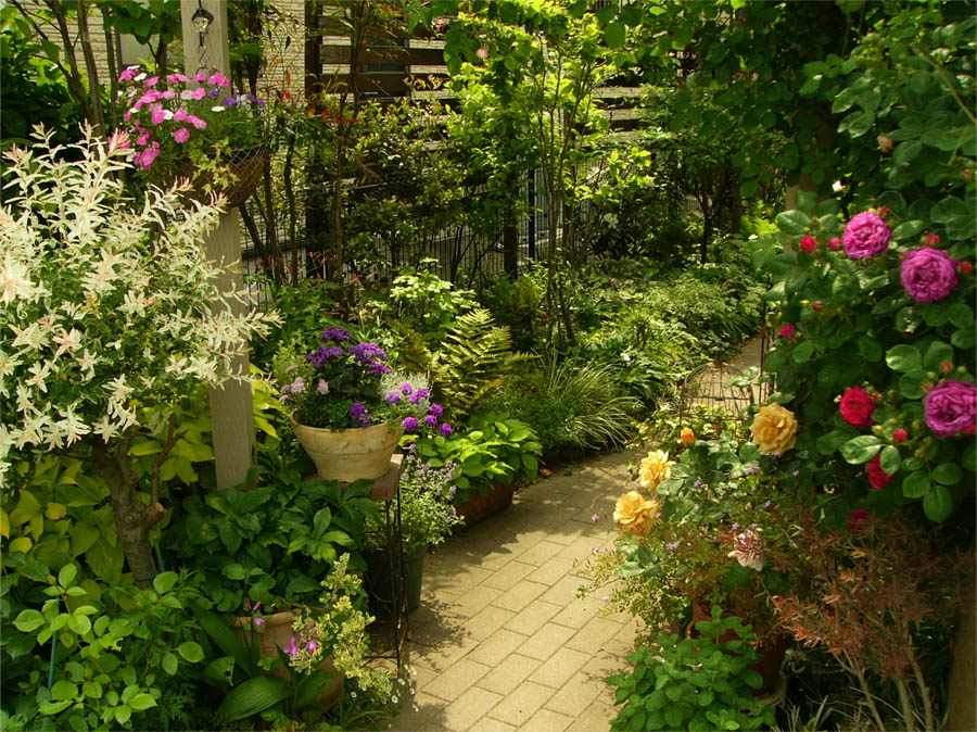 ![]() 庭の奥では小路が二股に分かれ、庭の空間に厚みと変化を与えてくれます ![]() 木洩れ陽が射す庭の隅の小路。行き止まりなのに奥行きを感じます。 ![]() 山道のような赤い小石が敷かれた小路 ![]() 庭の入口はレンガの小路。脇をバラなどの花が彩ます。 ![]() バラが屋根のように覆う門。さりげなく置かれた小物が可愛らしい。 |