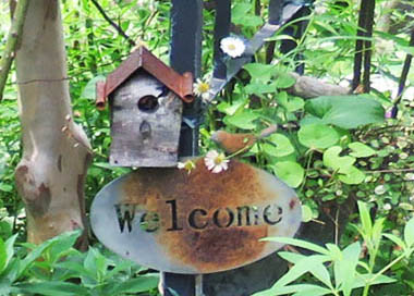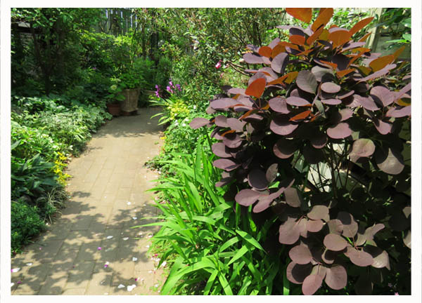![]() 勝手口に続く小路入り口に造られた門と飾り棚 ![]() 数え切れないほどの多種多様な葉っぱに覆われる庭 ![]() チョコレート色の丸い葉っぱが印象的 ![]() 入り口周辺を彩る花や葉っぱ |