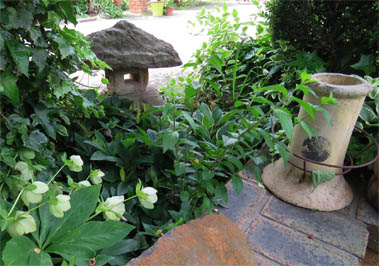 ![]() カフェ入り口脇の庭 ![]() 蔵の脇は和の装い ![]() 緑の中に置かれた石灯篭やオブジェ ![]() ライムストーンの石畳、カーペット状の花 |