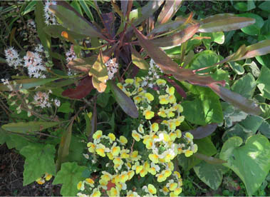 ![]() 黄色の葉っぱが鮮やか ![]() ひっそりと咲く白と淡い黄緑のクレマチス |
