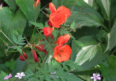 ![]() バラやデージー、ガザニア、様々な色や形状の花と葉っぱ ![]() 様々な葉っぱの中で咲くクロフウロ |