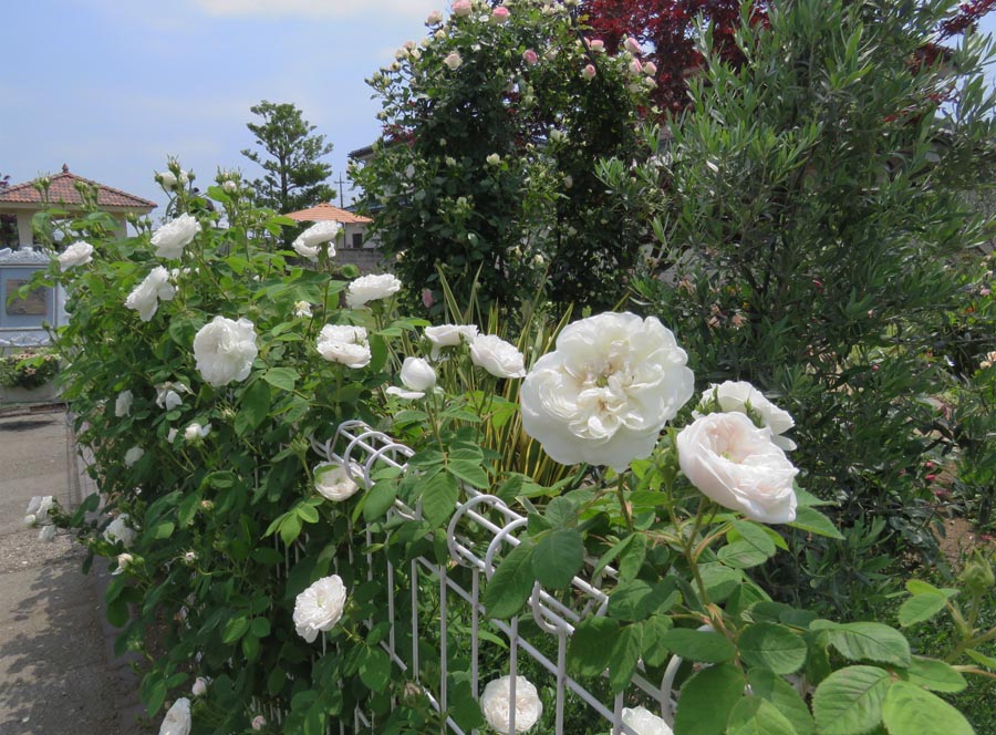 今年2年目の参加の「My Dog's Garden」。伊勢崎市市場町の住宅地にあって、大通り沿いではありませんが、近付けば、伸び伸びとした広い芝生スペースが広がっていて、すぐにその存在が分かります。芝生広場と道路との間には花壇が造られていて、中にはオリーブやモミジなどの涼しそうな樹木が植えられ、緩いカーブを描いた小路が一回りしています。小路を歩けばバラをメインに様々な花をすぐ近くで愛でることができます。庭と道路を隔てるフェンスは細くて白いワイヤ製で高さも低く、道路側からも眺めることができ、まさにオープンガーデンです。 もう一ヶ所の花壇は門を入ってすぐの場所にあって、屋根は白い木のパーゴラで覆われ、バラが咲き、寄せ植えの大きな鉢が置かれ、足元や周囲をダスティミラーやデージー、ジギタリスなどが埋めるように咲いています。花壇の中央には休憩コーナーが設けられ、木製ベンチが置かれ、素朴でアットホームな雰囲気を醸し出しています。 これらの花壇は十分に広い大きさですが、芝生スペースの広さが圧倒的で「My Dog's Garden」の存在を印象付けます。名前の通り、庭主さんの愛犬が飛び回れるように造った庭で、その片隅にはイタリア風の東屋があります。東屋にはテーブルやベンチが置かれ、大きな鉢の寄せ植えも置かれ、オープンカフェのようです。庭造りは今年で8年目とのことですが、以前は雑草が茂る残土置き場のようだった土地を購入してこのような庭に仕上げたとのことです。 今年は庭主さんに自宅の庭も案内していただきましたが、こちらも和風庭園として手入れされていて、こちらだけでも一つのオープンガーデンになるようです。これだけの庭を整備し手入れする庭主さんの熱い想いが伝わってくる「My Dog's Garden」でした。(2016/7/4 記) |