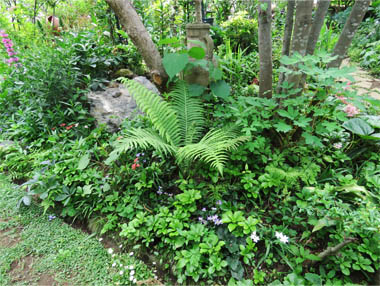 ![]() 石畳の小路。木立の根元を埋める葉っぱ。密やかに咲くアスチルベやミヤコワスレ。 ![]() 色や形、大きさが異なる様々な葉っぱに埋まる庭 |