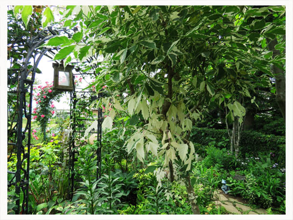 ![]() 様々な要素が含まれて変化に富んだ門周り ![]() 石塀の上を飾るバラのアーチ ![]() 柱の回りに寄せ植えされた様々な葉っぱ |