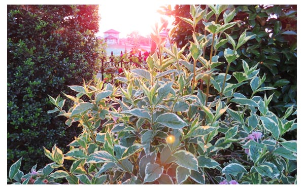 ![]() 花弁の中央が桜色の可愛らしいバラ。夕日に映えます。 ![]() 満開のカルミア。周囲にはクレマチスやシロバナシラン。 |