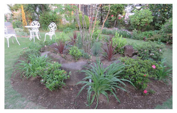 ![]() 真っ赤なシャクナゲ ![]() 緑に囲まれる庭。芝生の中央には自然石で囲まれた花壇。 |