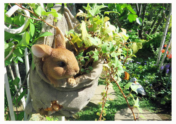 ![]() 木々の足元には石畳や飛び石が敷かれ、根元は様々な葉っぱ類が植えられています。 ![]() ガーデン小屋と林の間にはテーブルコーナー。ティータイムを誘います。 ![]() ウサギの鉢に植えられた寄せ植え |