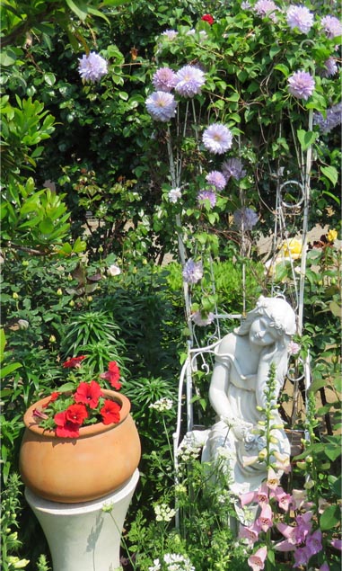 「Mother's Garden」の主役はバラ。その種類は180〜200種類と、比類なき多さです。葉っぱや茎の剪定方法、土の選定や施肥、土中や葉っぱに付着する害虫対策など、どれもハードルが高いバラの育て方。そんな私にとって、約200種類のバラを育てていることは驚嘆に値します。バラの種類の多さから「バラ園」と称するに相応しい庭ですが、「Mother's Garden」はバラ園に留まることなく、バラとバラの隙間や遊歩道脇を様々な花が埋め、色や形、大きさの様々なバリエーションを見せる花や葉っぱが、園全体をふくよかに演出しています。更に庭に楽しさと面白さを加えているのが、置物やガーデングッズ。動物やエンジェルの置物、白いパーゴラや椅子等が庭に上品で楽しい空間を醸し出しています。