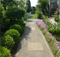 ![]() 門右手の庭への入り口。周囲を飾るガーベラやクレマチス。 |