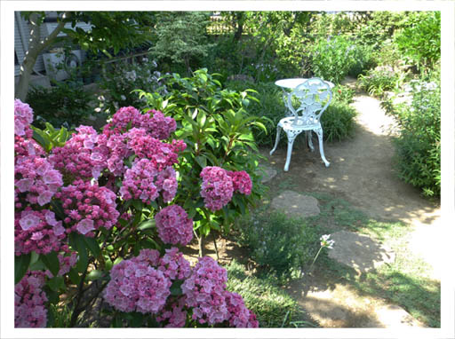 ![]() 木の根元で咲く花々に木漏れ陽が優しい。 ![]() カルミア満開。遊歩道の緑、白い椅子とベンチ。 |