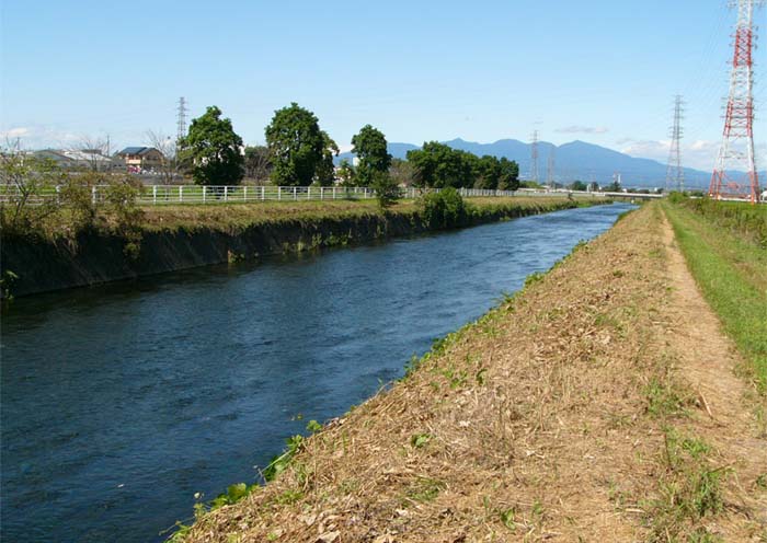 ![]() 早川・境上渕名 早川と堤防、サイクリングロードの並木、後方には赤城山 2009/9/13 |