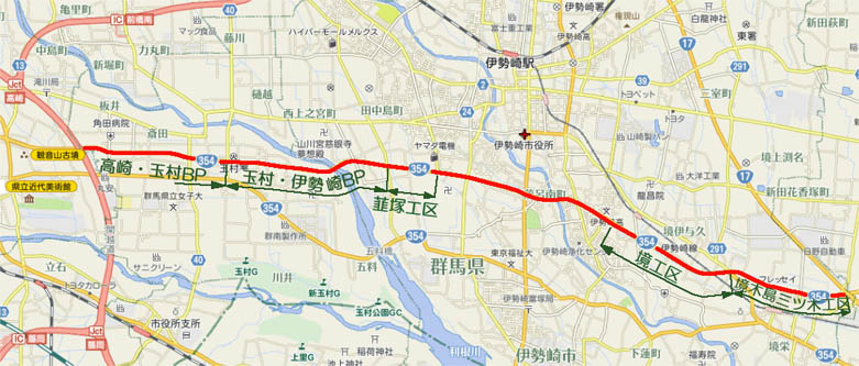 ![]() 東毛広域幹線道路(354BP)・玉村町〜伊勢崎市区間の地図 |