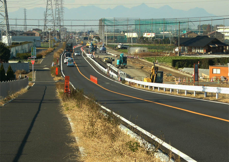 ![]() 高盛土区間付近。 手前は暫定形で供用中の南側2車線 2013/12/13 後方には赤城山 |