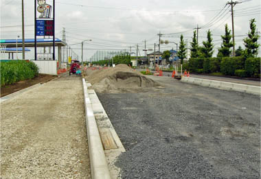 | 当工区の境百々交差点以東に比べて工事が先行していて、「境ふれあい」パーク南側では路盤工を完了し、公園〜境百々区間でも間もなく路盤工完了の状況です。 車道、歩道共に路盤工が進行中。西側(境上矢島交差点寄り)が先行。(2014/2/5 記) |