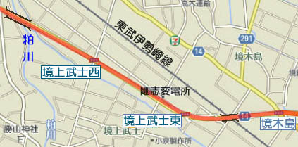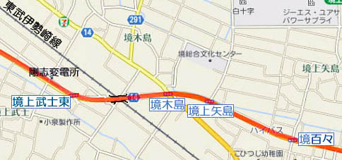 | 東武伊勢崎線の跨線橋の西側、盛土区間の起点付近に「境上武士東」交差点があります。 この交差点は直進と右折はできません。 |