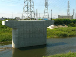 ![]() 橋脚(右岸上流から) 鉄骨骨組みは仮設用ステージ ![]() 橋脚(右岸下流から) |