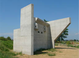 ![]() 完成した橋脚(左)と左岸橋台(右後方)・後方が境方向 2010/7/4 |