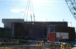 ![]() 据え付けを終えた主桁部材と、 背面側のボックスカルバート (右岸下流側から)2012/2/4 ![]() 主桁を吊上げ架設(右岸下流側から) 2012/2/4 ![]() 吊り上げ中の主桁(右岸下流側から) 2012/2/4 |