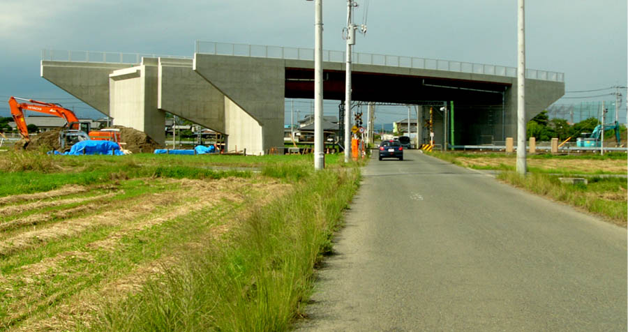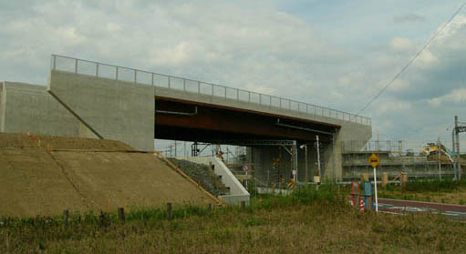 ![]() 桁下空間の広い跨線橋が 広い水田地帯において、一際目立ちます。(南東側から) 跨線橋前後の盛土区間では、跨線橋手前のボックスカルバートまでの盛土工事を終え、 ボックスカルバートと下部工背面の区間の盛土が残るばかりです。 2012/7/8 |