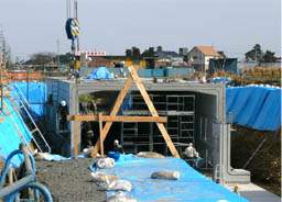 この位置のすぐ下流側では伊勢崎市が名和幹線の韮川・ボックスカルバートの布設工事を進めていますが、そちらは現場打ちによる施工なので、近接区間での現場打ちと二次製品とによるボックスカルバートの施工風景を同時に見学できることは、貴重なことと思います。 二次製品は、現場打ちと比べると、鉄筋組立て、型枠・足場の組立て/解体作業がないので、現場もスッキリとし、工期短縮にも有利です。また部材厚を薄くしたいなどの理由でPC部材にする場合には、緊張機器設置の関係で、橋梁現場などを除けば現場打ちは不利(余り例がない)です。ただ一般的には現場打ちの方がコストが安いと言われています。 実際、どんな工法・形式を選択するかは、現場の諸条件や予算に依存するので、現場ごとの条件により比較選定します。(2012/3/22 記) |