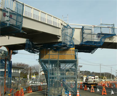 本日6月15日深夜、国道50号の鹿交差点と笠懸小学校との間にあった旧横断歩道橋の撤去工事が行われました。撤去工法はオールテレーンクレーンによる桁一括吊り工法で、市道側と国道側の2つの桁について、それぞれ10分の通行止めを行って実施されました。![]() 最初に撤去されたのは重量が軽い市道側の桁。通行止め時間は午前1時から10分間。2回目の撤去は重量が重い国道側の桁で、通行止めは午前1時50分からの10分間。クレーン設置位置は国道の北側で、桁の西側。クレーン吊り上げ荷重は荷重吊り上げ時のブーム旋回半径を主要因として決まるので、重量が重い国道側の桁吊り上げ時の旋回半径を小さくするための配慮です。 吊り上げ作業時は、桁がワイヤで一点吊り状態の不安定状態となるので、最も気になるのは風荷重。この日は幸運にも霧雨が時々降りながらもほぼ無風状態。桁上と桁下で大勢の作業員の方たちが吊り作業の準備を行い、道路通行止め開始と共に、徐々に桁が吊り上げられ、予定時間通りに作業を完了。交通止め時間短縮のため、桁と橋脚とを連結する高力ボルトは事前に外され、仮締め状態で撤去に臨み、また、桁両側の階段桁は交通止めなしに行えるので、事前に撤去されたとのことです。 この日、深夜の作業にも関わらず、国道の両側には数十名のギャラリーが集まり、作業を遠巻きに見守っていました。鉄道や道路上の桁撤去工事を見学する機会は少なく、伊勢崎近辺では、2007年11月にJR両毛線伊勢崎高架橋工事時に跨線橋のクレーン一括吊り撤去が行われましたが、残念ながら作業時は見逃したので、今回の見学が初めての体験でした。無事に作業を完了し、大勢の関係者の皆さん、お疲れ様でした。貴重な見学をさせていただきました。 (2013/6/15 記) |