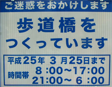 ![]() 歩道橋工事中の通行不可箇所 期間=2012年8月27日〜2013年3月下旬 2012/11/18 |